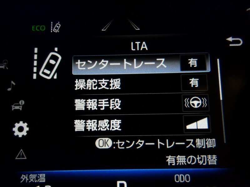 「レーンディパーチャーアラート」セットスイッチ。車線または走路からの逸脱の可能性を警告すると共に、車線または走路からの逸脱を避けるためのハンドル操作の一部を支援する機能です。