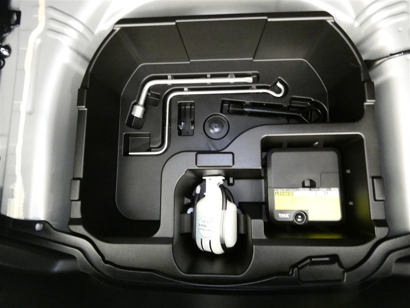 パンク修理剤とエアーポンプのセットです。スペアタイヤは装備していませんが空いたスペースを小物入れとして使用できます