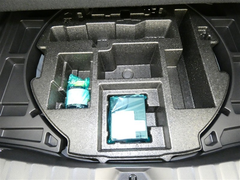 最近はパンク修理キットが標準ですね。タイヤの無い分軽量化と収納スペース確保できますね。