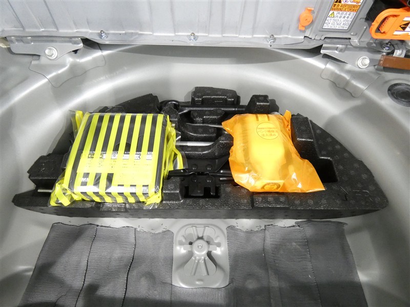 パンク修理剤とエアーポンプのセットです。スペアタイヤは装備していませんが空いたスペースを小物入れとして使用できます