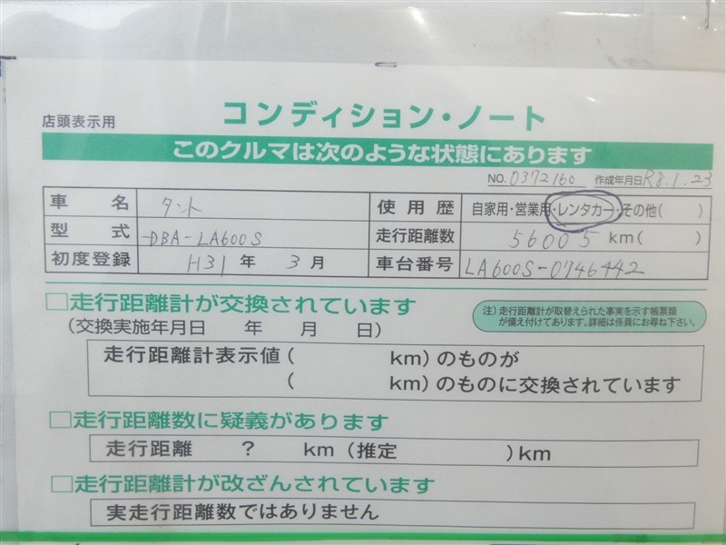入庫時のメーター走行距離になります。また構内移動等により若干距離が伸びることがありますがご了承ください。