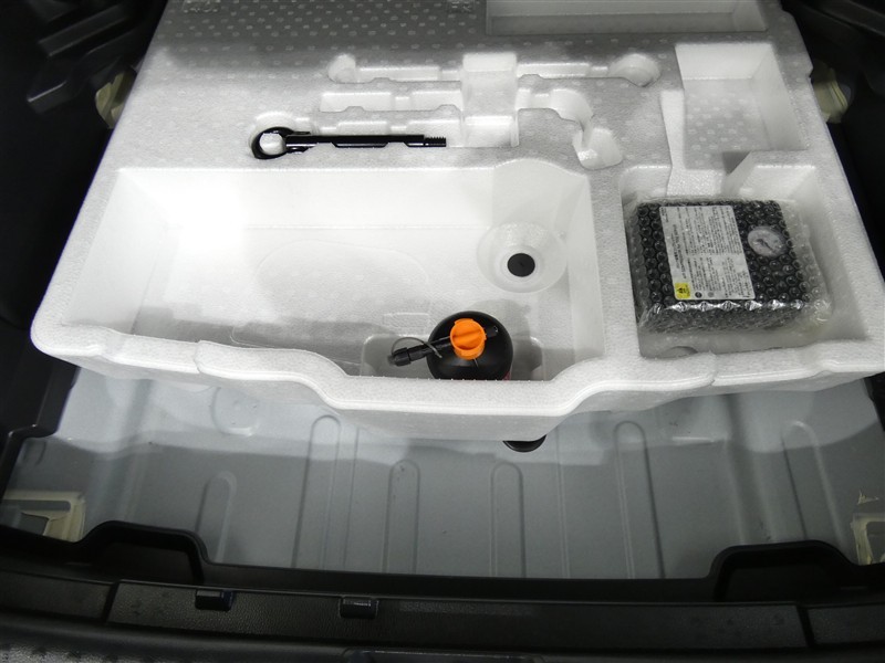 パンク修理剤とエアーポンプのセットです。スペアタイヤは装備していませんが空いたスペースを小物入れとして使用できます