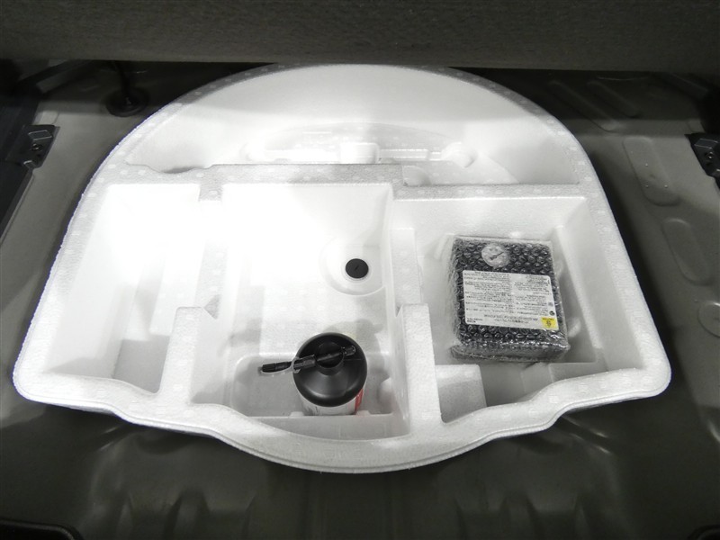 パンク修理剤とエアーポンプのセットです。スペアタイヤは装備していませんが空いたスペースを小物入れとして使用できます