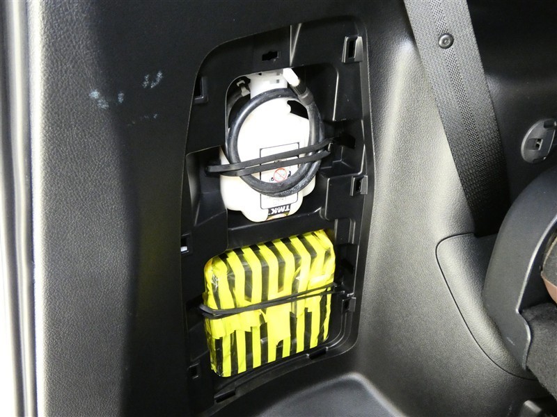 パンク修理剤とエアーポンプのセットです。スペアタイヤは装備していませんが空いたスペースを小物入れとして使用できます