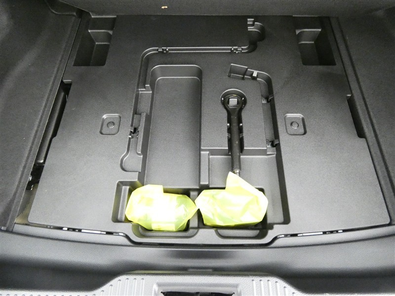 最近はパンク修理キットが標準ですね。タイヤの無い分軽量化と収納スペース確保できますね。