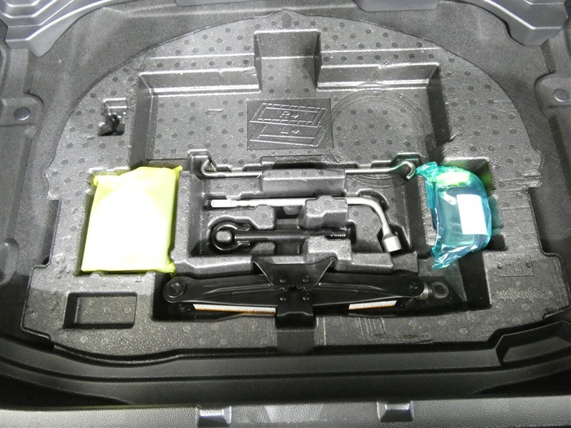 パンク修理剤とエアーポンプのセットです。スペアタイヤは装備していませんが空いたスペースを小物入れとして使用できます