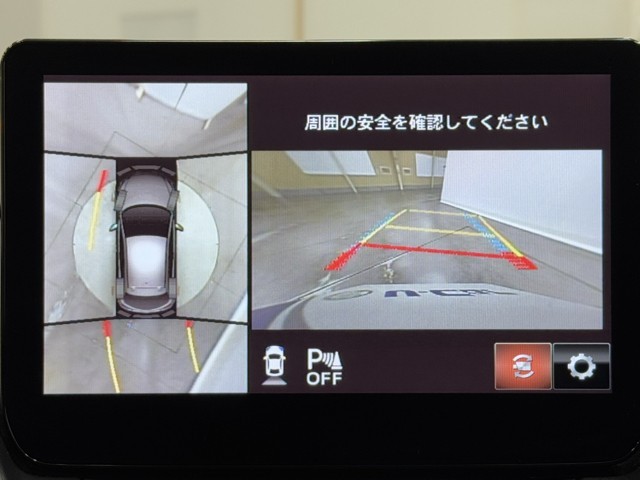 パノラミックビューモニターシステムが付いているので車の上から見た映像が確認できますよ。 一目で車両周辺の情報を確認できますが、直接安全をご確認下さい。