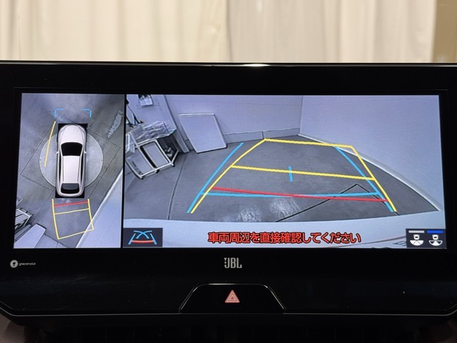パノラミックビューモニターシステムが付いているので車の上から見た映像が確認できますよ。 一目で車両周辺の情報を確認できますが、直接安全をご確認下さい。