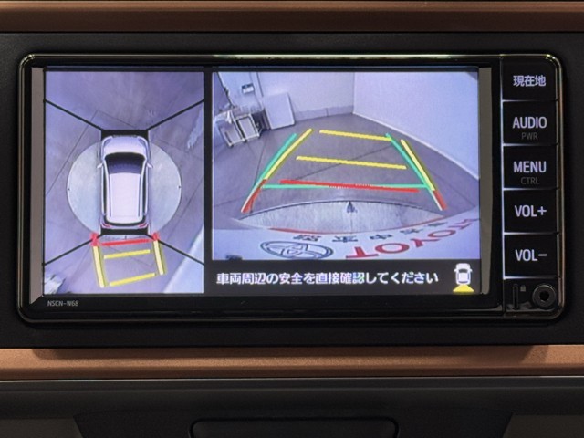 パノラミックビューモニターシステムが付いているので車の上から見た映像が確認できますよ。 一目で車両周辺の情報を確認できますが、直接安全をご確認下さい。