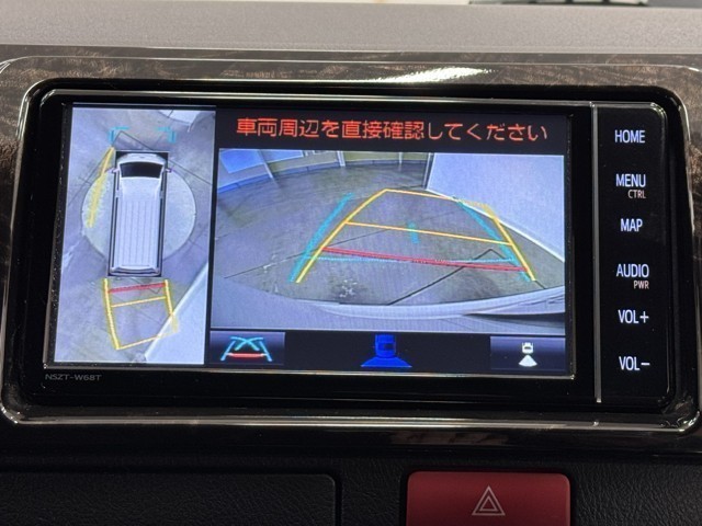パノラミックビューモニターシステムが付いているので車の上から見た映像が確認できますよ。 一目で車両周辺の情報を確認できますが、直接安全をご確認下さい。