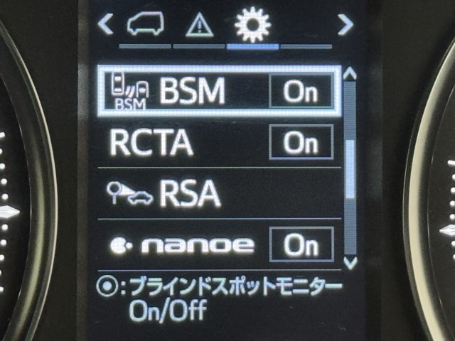 車線変更時などに、ドアミラーでは確認しにくい後側方エリア(ブラインドスポット)に存在する車両をレーダーで検知。警告サインをドアミラー等に表示することで、運転者に注意喚起する機能。