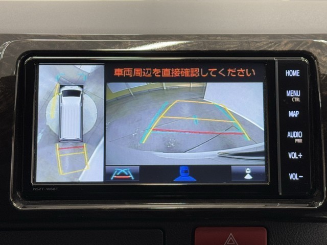 パノラミックビューモニターシステムが付いているので車の上から見た映像が確認できますよ。 一目で車両周辺の情報を確認できますが、直接安全をご確認下さい。