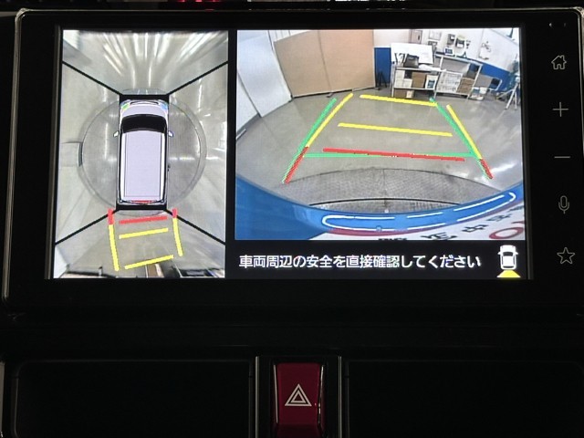 パノラミックビューモニターシステムが付いているので車の上から見た映像が確認できますよ。 一目で車両周辺の情報を確認できますが、直接安全をご確認下さい。