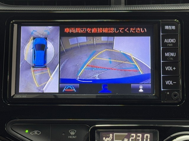 パノラミックビューモニターシステムが付いているので車の上から見た映像が確認できますよ。 一目で車両周辺の情報を確認できますが、直接安全をご確認下さい。