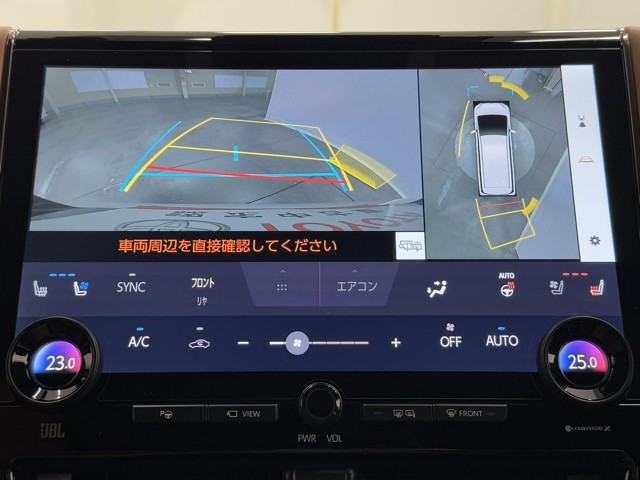 パノラミックビューモニターシステムが付いているので車の上から見た映像が確認できますよ。 一目で車両周辺の情報を確認できますが、直接安全をご確認下さい。