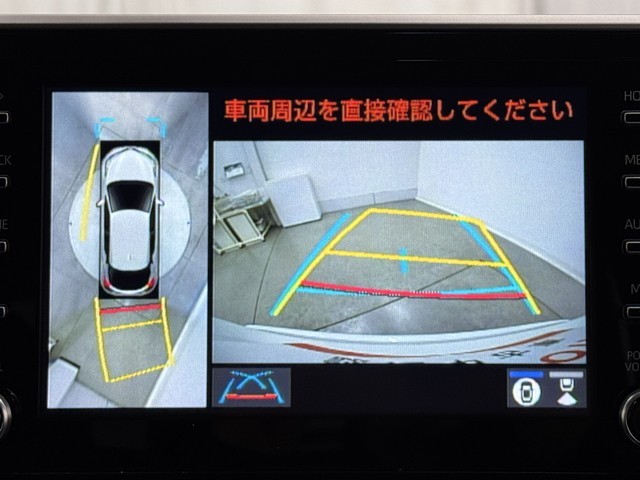 パノラミックビューモニターシステムが付いているので車の上から見た映像が確認できますよ。 一目で車両周辺の情報を確認できますが、直接安全をご確認下さい。