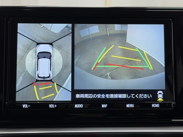 パノラミックビューモニターシステムが付いているので車の上から見た映像が確認できますよ。 一目で車両周辺の情報を確認できますが、直接安全をご確認下さい。