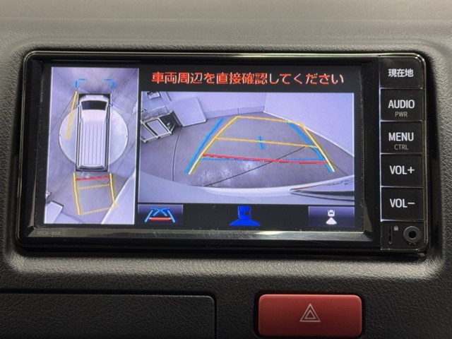 パノラミックビューモニターシステムが付いているので車の上から見た映像が確認できますよ。 一目で車両周辺の情報を確認できますが、直接安全をご確認下さい。