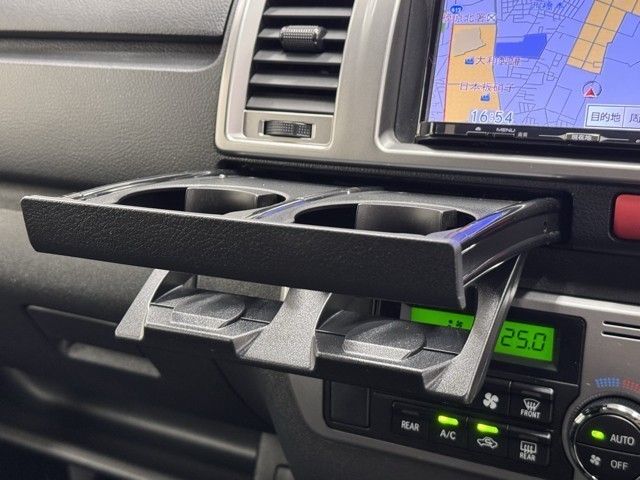カップホルダーです。 長い間乗っていると沢山置く場所が欲しくなりますよね。 缶ジュースを開けて運転していると振動で倒れないかヒヤヒヤしちゃいますよね。 意外に無いと困る装備ですよね。