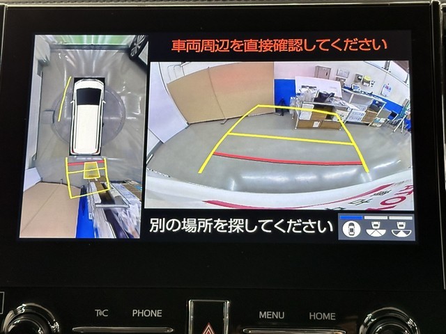 パノラミックビューモニターシステムが付いているので車の上から見た映像が確認できますよ。 一目で車両周辺の情報を確認できますが、直接安全をご確認下さい。
