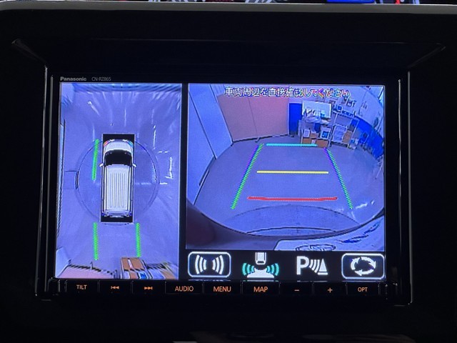 パノラミックビューモニターシステムが付いているので車の上から見た映像が確認できますよ。 一目で車両周辺の情報を確認できますが、直接安全をご確認下さい。