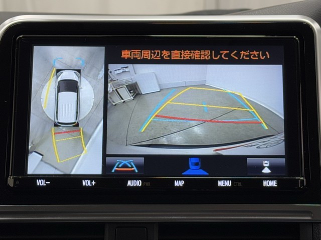 パノラミックビューモニターシステムが付いているので車の上から見た映像が確認できますよ。 一目で車両周辺の情報を確認できますが、直接安全をご確認下さい。