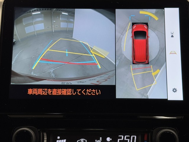 パノラミックビューモニターシステムが付いているので車の上から見た映像が確認できますよ。 一目で車両周辺の情報を確認できますが、直接安全をご確認下さい。