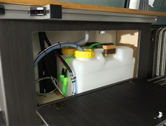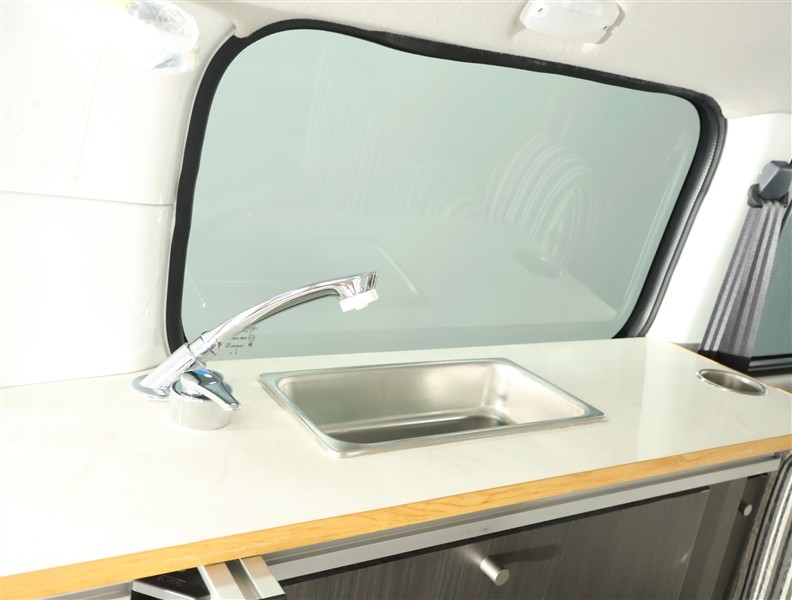上水8L・汚水8L:タンク調理や普段使いにも。蛇口を引き出してシャワーとしても使えます。バックドア付近に配置されているため、タンクの出し入れもスムーズです。