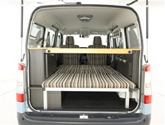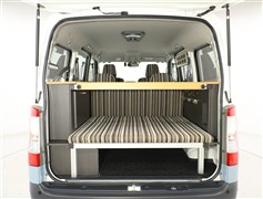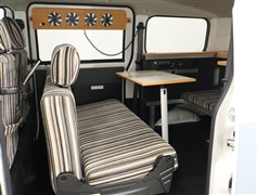 使い勝手のよいコの字のテーブルは、ダイネットモードでもベッドモードでも大活躍。便利な収納ラックが快適な居住性を実現。
