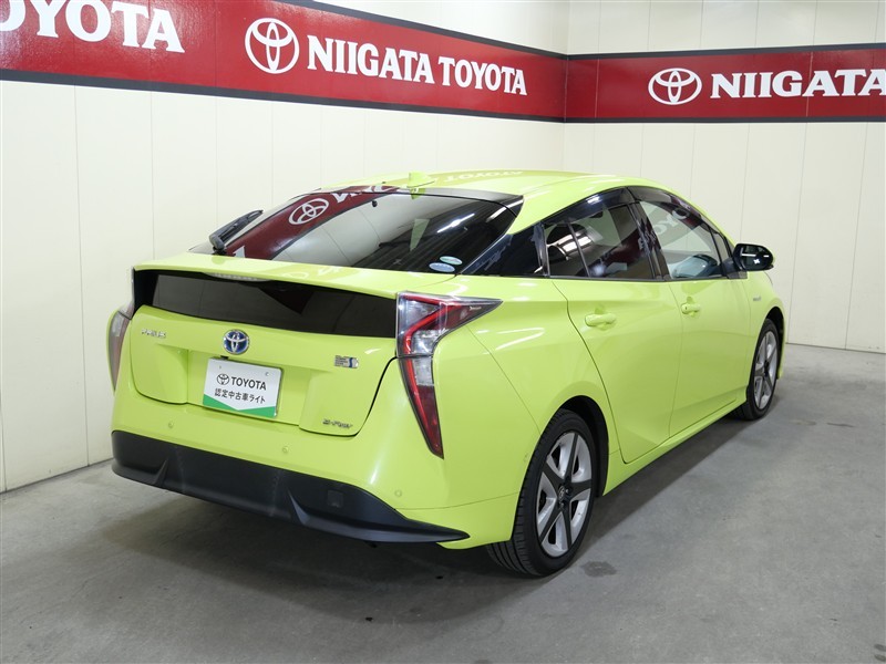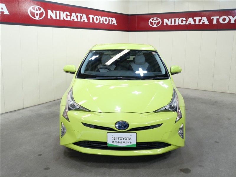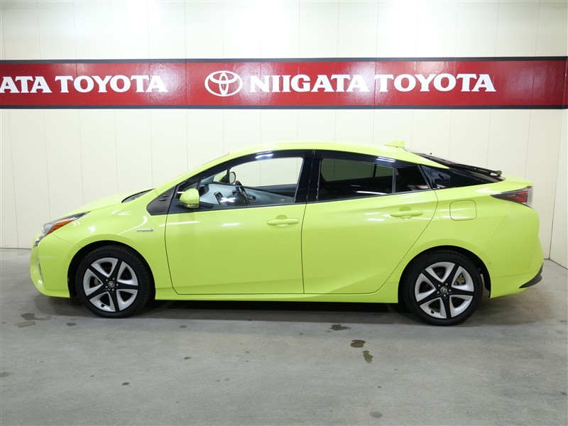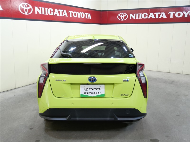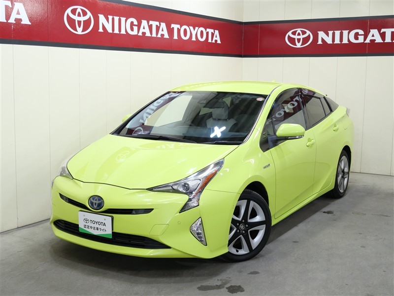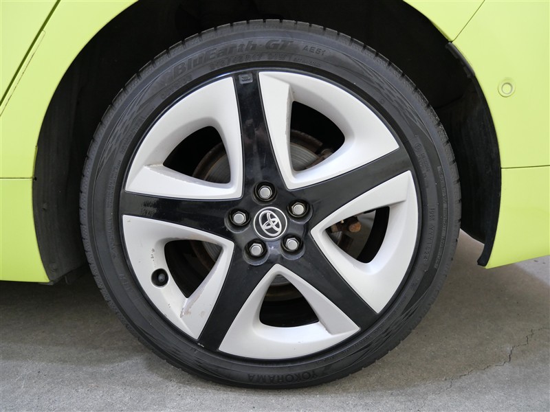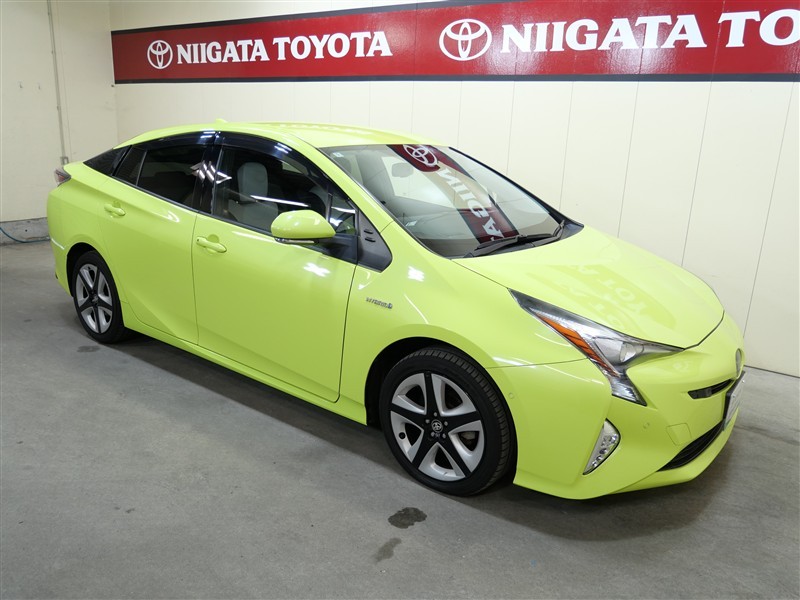 プリウスAツーリングセレクション4Wになります。ボディカラーはサーモテクトライムグリーン、太陽光の熱を反射し、真夏の車内温度上昇を抑える遮熱機能を持つ特殊なグリーン系カラーで鮮やかな黄緑色です。