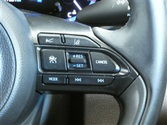 レーダークルーズコントロールスイッチです。高感度なミリ波レーダーセンサーの情報により、先行車を認識しています。先行車の車速が変化しても、設定車速内で車速に応じた適切な車間距離を保ちながら追従走行します