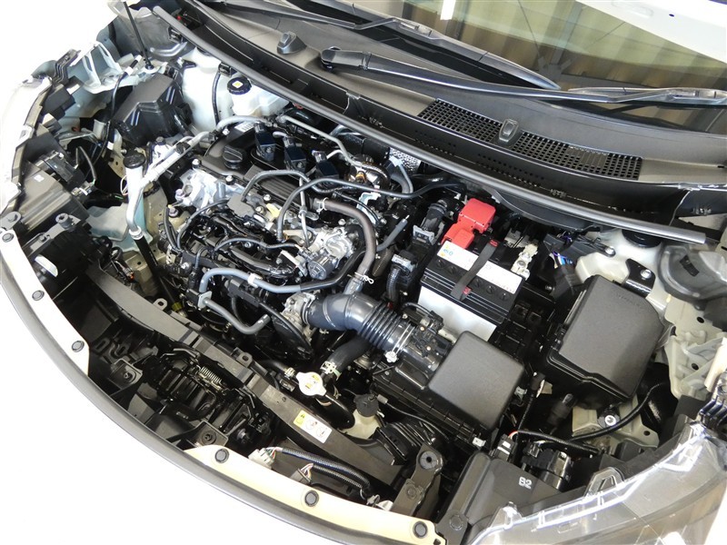 1500ccガソリンエンジンです。エンジンルームはボンネット裏からヒンジの奥まで油汚れを除去しています。
