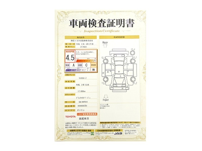 トヨタが認めた検査のプロが、すみずみまで車両をチェックした≪車両検査証明証≫が発行されています。おクルマの状態がわかりやすく安心ですよ♪