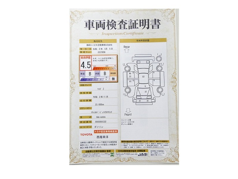 トヨタが認めた検査のプロが、すみずみまで車両をチェックした≪車両検査証明証≫が発行されています。おクルマの状態がわかりやすく安心ですよ♪