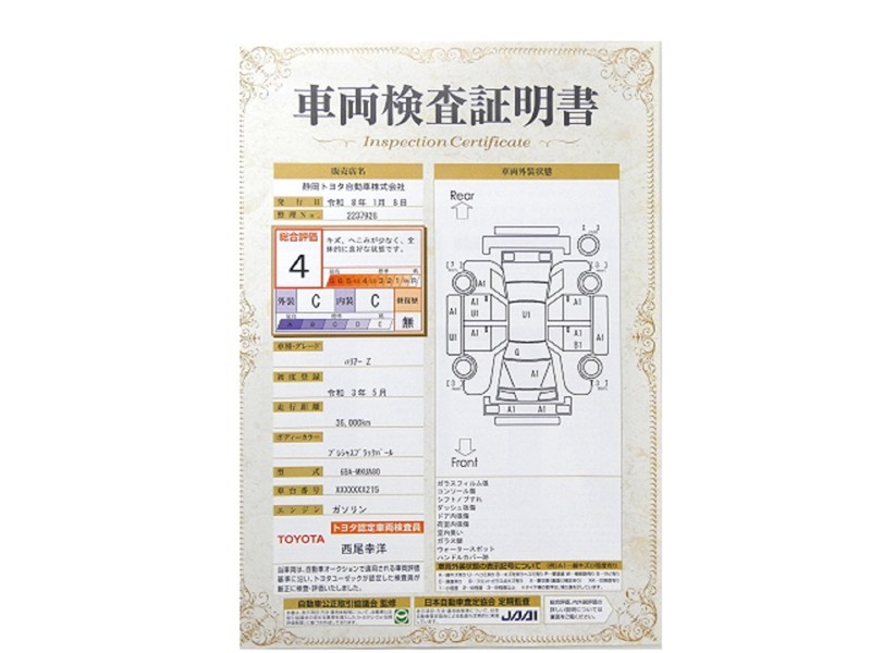 トヨタが認めた検査のプロが、すみずみまで車両をチェックした≪車両検査証明証≫が発行されています。おクルマの状態がわかりやすく安心ですよ♪
