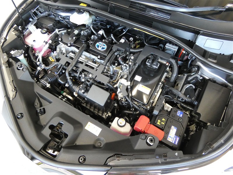 1,800ccのハイブリッドエンジンです。エンジンルームはボンネット裏からヒンジの奥まで油汚れを除去しています。