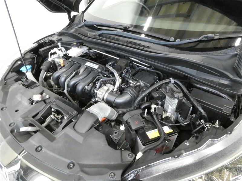 1500㏄のガソリンハイブリッドエンジンです。エンジンルームはボンネット裏からヒンジの奥まで油汚れを除去しています。