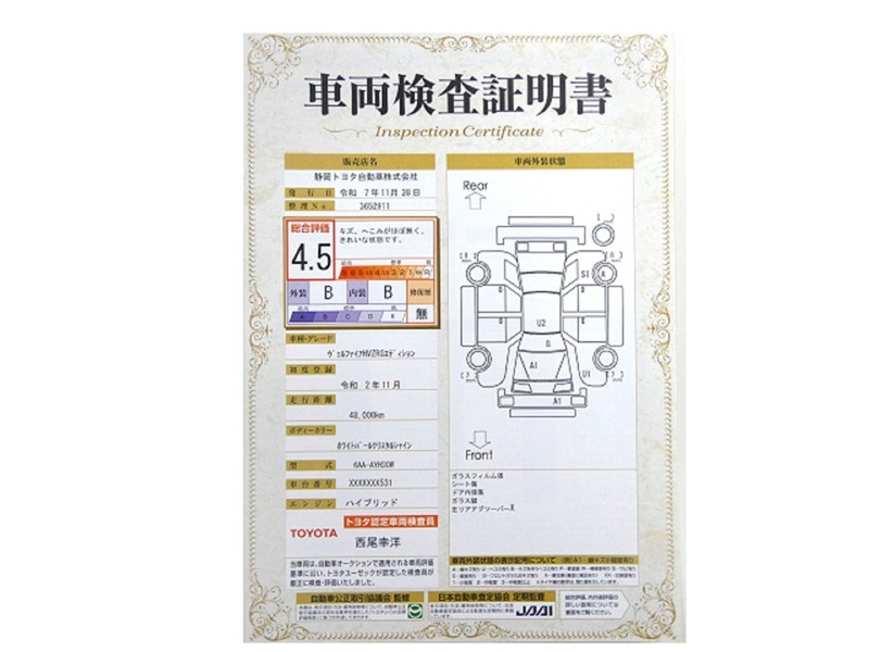トヨタが認めた検査のプロが、すみずみまで車両をチェックした≪車両検査証明証≫が発行されています。おクルマの状態がわかりやすく安心ですよ♪
