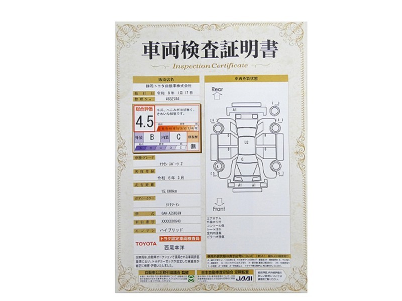 トヨタが認めた検査のプロが、すみずみまで車両をチェックした≪車両検査証明証≫が発行されています。おクルマの状態がわかりやすく安心ですよ♪