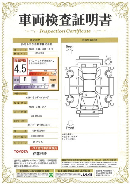 車両検査証明書付きです。 総合評価は4.5点で、キズ、へこみがほぼ無く、きれいな状態のお車です。