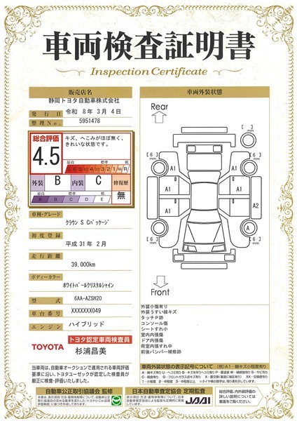 車両検査証明書付きです。 総合評価は4.5点で、キズ、へこみがほぼ無く、きれいな状態のお車です。