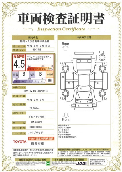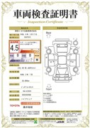車両検査証明書付きです。 総合評価は4.5点で、キズ、へこみがほぼ無く、きれいな状態のお車です。