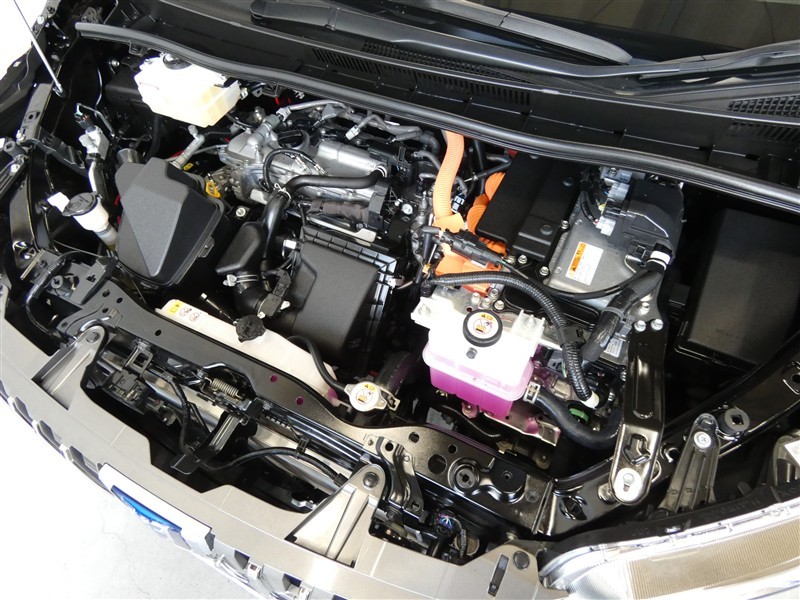 1800ccのガソリンハイブリッドエンジンです。エンジンルームはボンネット裏からヒンジの奥まで油汚れを除去しています。