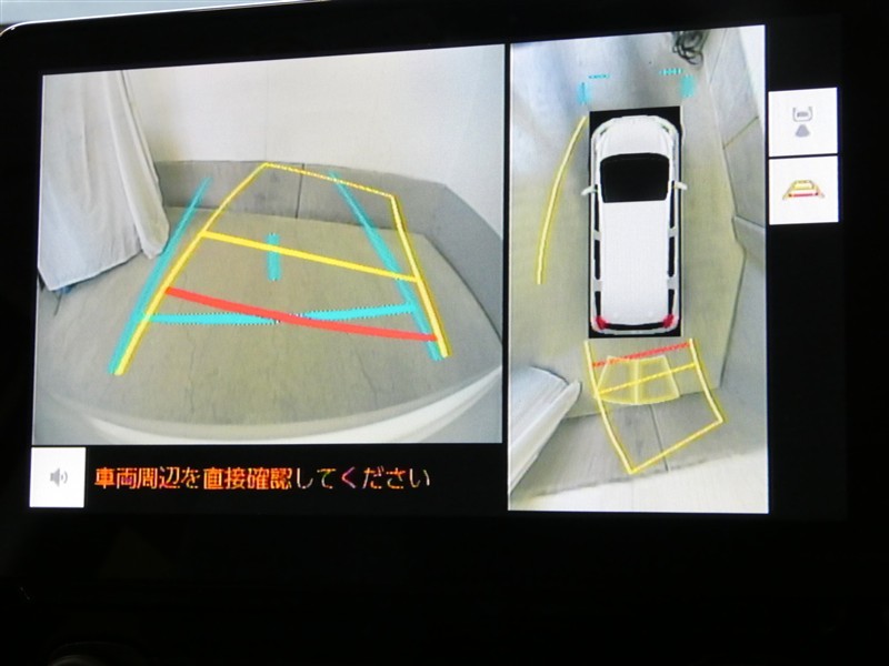ハンドル操作に連動してガイドラインが変化するバックガイドライン付きのバックモニター+パノラマビューモニター付きです。車庫入れや縦列駐車をサポートします。
