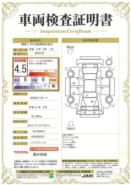 車両検査証明書付きです。 総合評価は4.5点で、キズ、へこみがほぼ無く、きれいな状態のお車です。