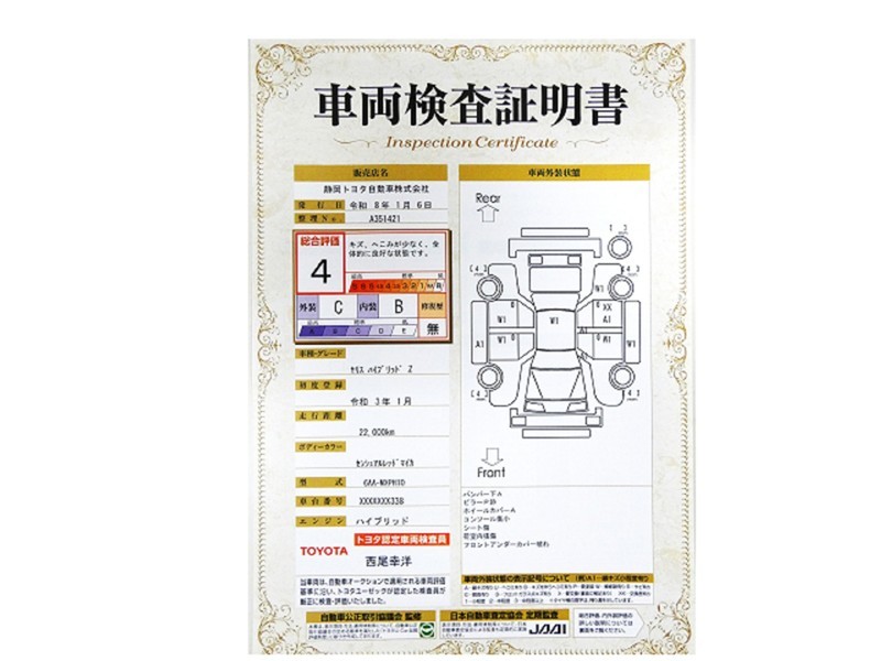トヨタが認めた検査のプロが、すみずみまで車両をチェックした≪車両検査証明証≫が発行されています。おクルマの状態がわかりやすく安心ですよ♪