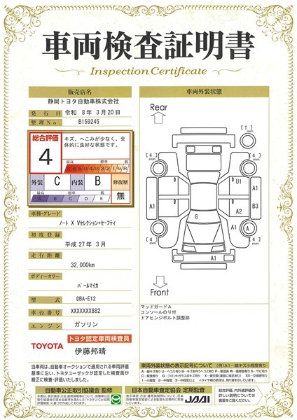 車両検査証明書付きです。おクルマの状態がわかりやすく安心ですよ♪