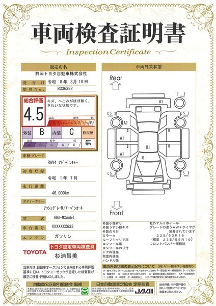 車両検査証明書付きです。 総合評価は4.5点で、キズ、へこみがほぼ無く、きれいな状態のお車です。