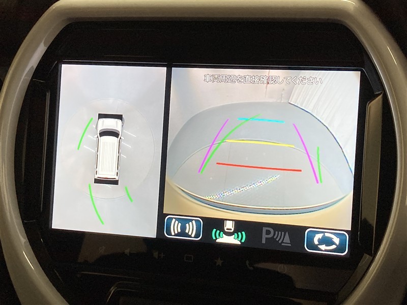 パノラミックビューモニターシステムが付いているので車の上から見た映像が確認できますよ。 一目で車両周辺の情報を確認できますが、直接安全をご確認下さい。