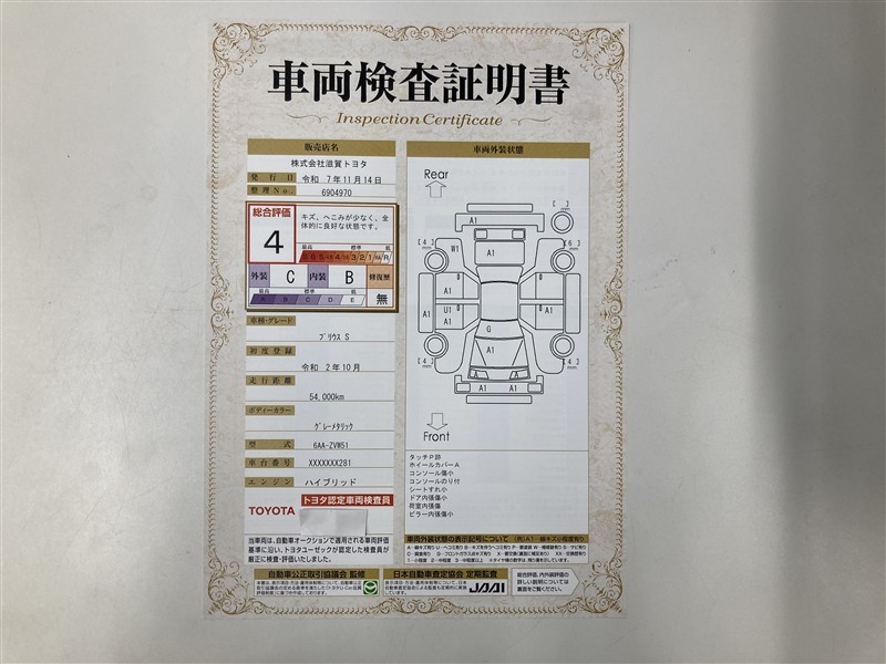 ※ 展示車両には上記と同様の評価点・状態表を「車両検査証明書」として搭載しております。